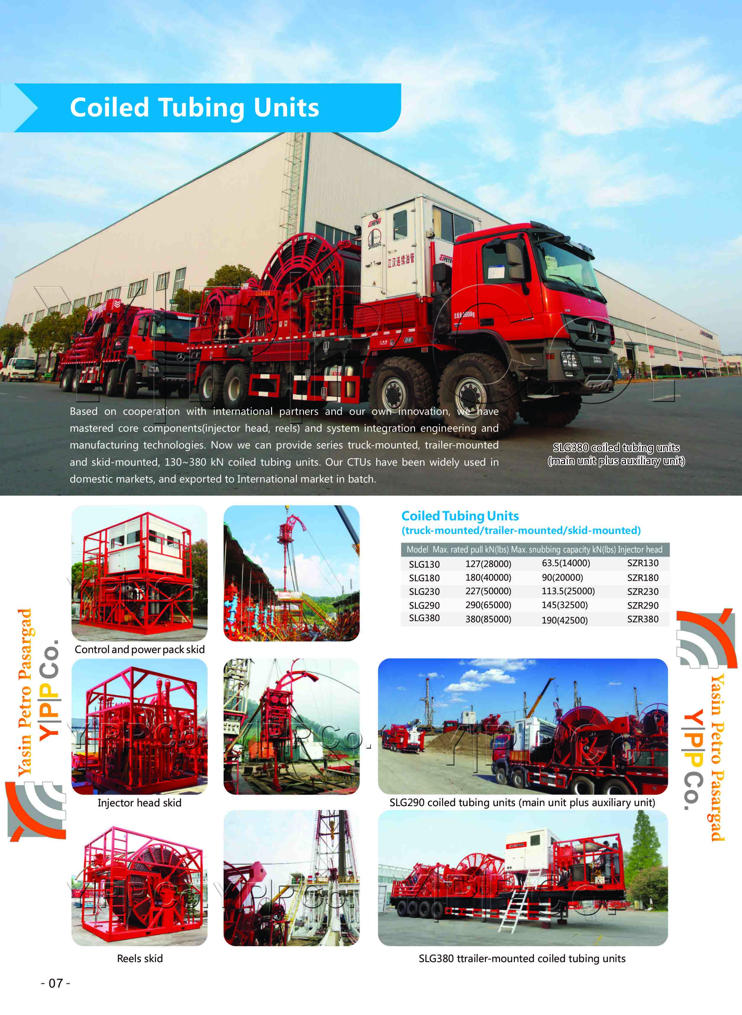 شرکت یاسین پترو پاسارگاد به عنوان تأمینکنندهی تجهیزات لوله مغزی سیار از تولیدکنندگان معتبر در بازار ایران فعال است و از سال 1394 به عنوان توزیعکنندهی رسمی و مرز خدمات پس از فروش شرکت اِس جِی پترولیوم ماشینری، ساینوپک در بازار ایران فعالیت میکند.